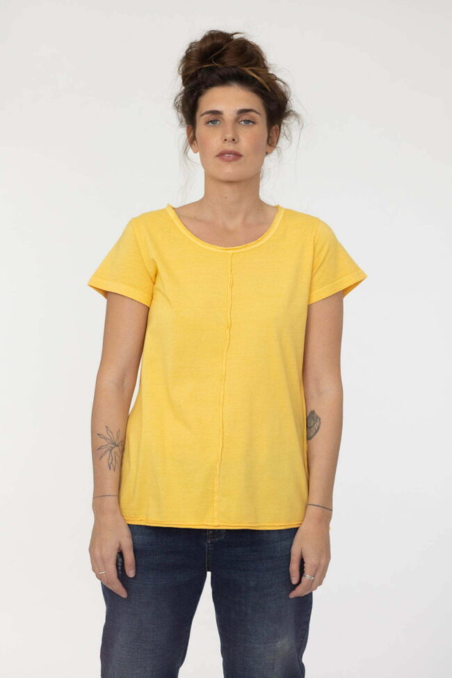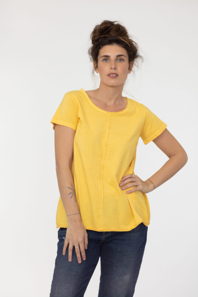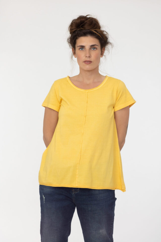 חולצת בייסיק בגזרת A נדיבה ומחמיאה עם תפר חיצוני לאורכה מלפנים ומאחור.