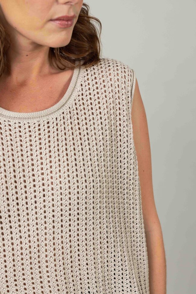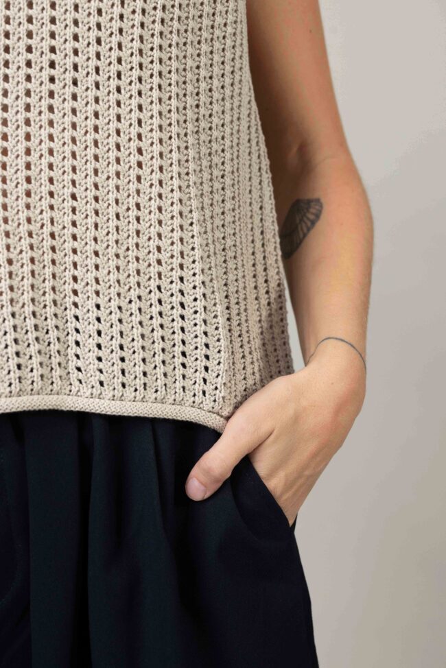 גופיית סריג בגזרה רחבה, מחשוף עגול וגימורים מתגלגלים