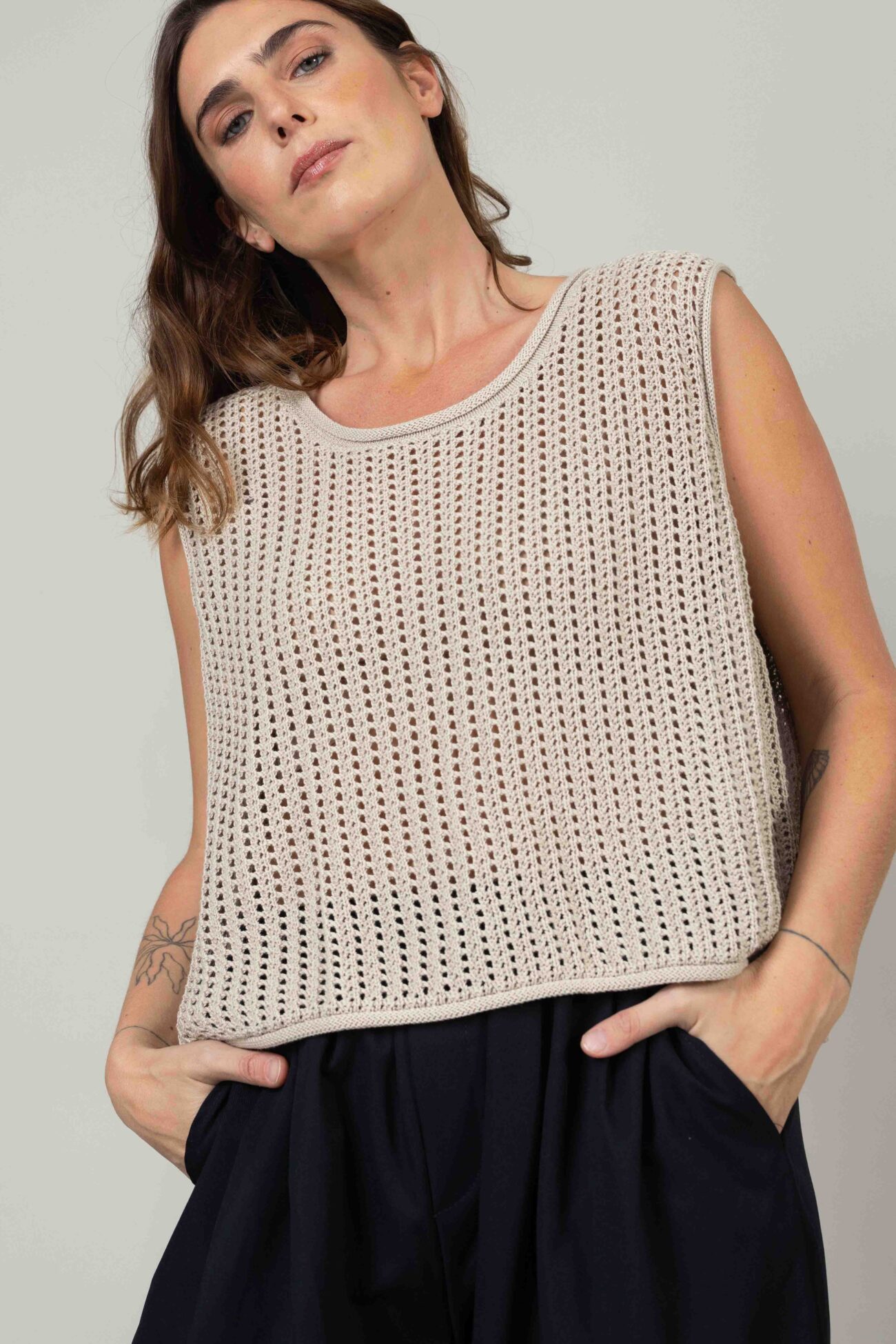 גופיית סריג בגזרה רחבה, מחשוף עגול וגימורים מתגלגלים