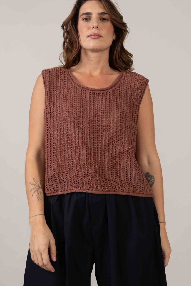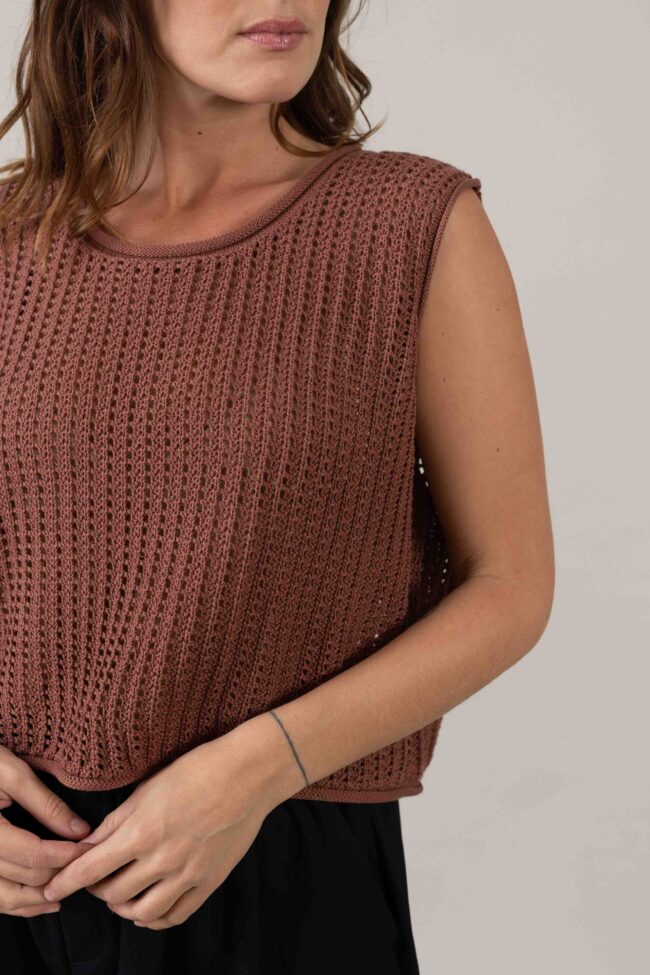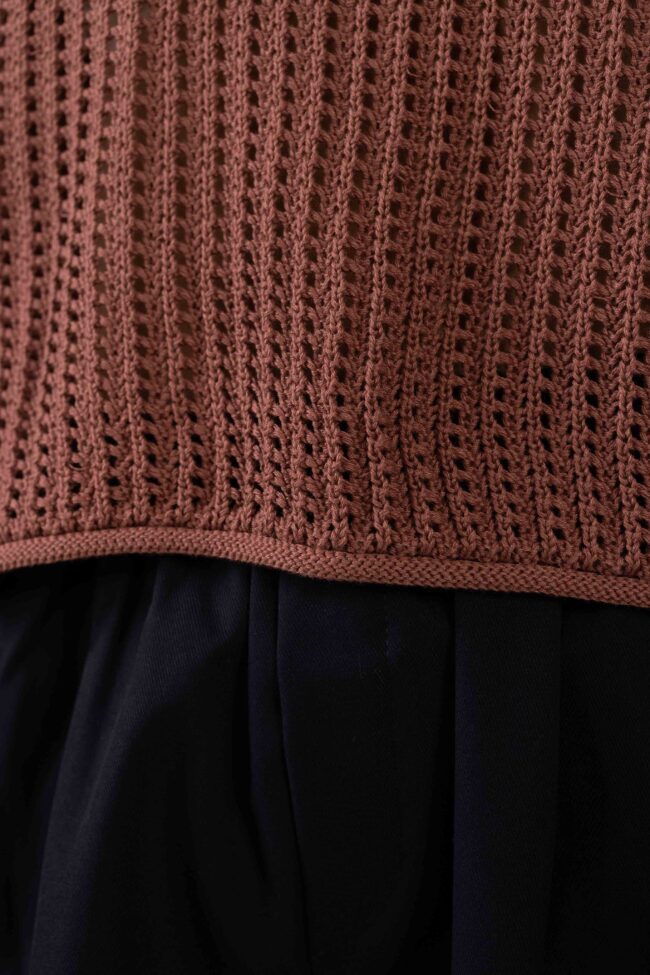 גופיית סריג בגזרה רחבה, מחשוף עגול וגימורים מתגלגלים